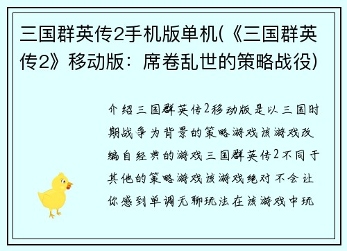 三国群英传2手机版单机(《三国群英传2》移动版:席卷乱世的策略战役)